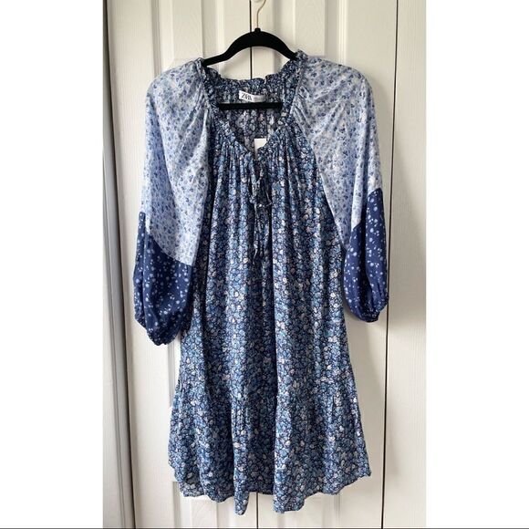 Mini dress with round elastic neckline and long balloon sleeves. A-line silhouette.