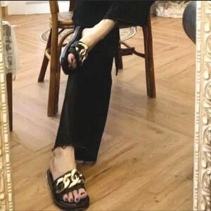 Black flat sandals. Wide strap across the front with maxi metallic chain detail. Sole with raised design. Sole height: 1.6 cm. / 0.6″