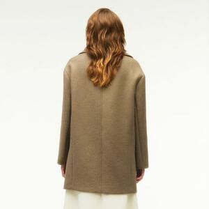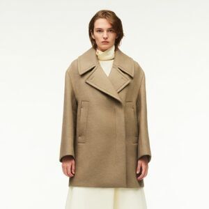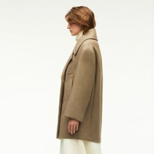 Cocoon style coat made of wool. Lapel collar and long sleeves with dropped shoulders. Front welt pockets and interior pocket. Tonal lined interior. Front double breasted button closure.