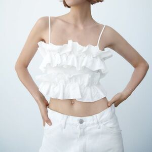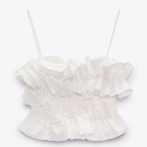 Top with a straight neckline and thin straps. Matching fabric with ruffles and embroidery.