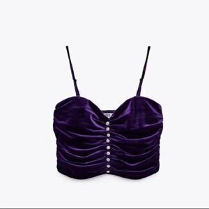 Short top with sweetheart neckline and adjustable, removable spaghetti straps. Smocked elastic fabric detail at back. Jewel buttons at front outer shell