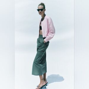 Bomber made of linen blend fabric. Round collar and cuffed long sleeves. Elasticized trim. Front metal zip closure.