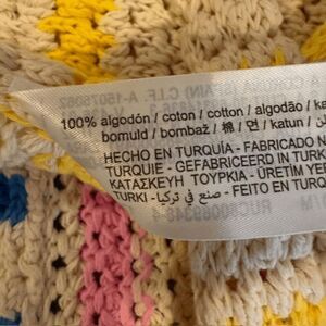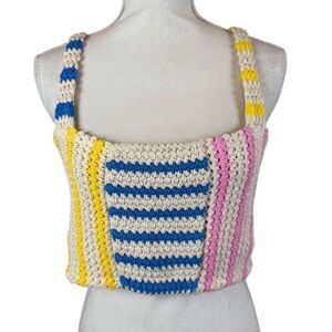 ZARA Crocheted Cotton Halter Crop Top Tank Pastel Blue Pink Yellow Size Medium. Excellent condition. See photos for details and unstretched measurements. Shop my closet and bundle multiple items for discounts and one shipping fee! color block, chunky knit, summer, vacation, young, flirty, retro