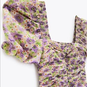 Straight neck mini dress with below-the-elbow length balloon sleeves. Elastic ruching detail. Side hidden in-seam zip closure.