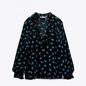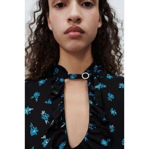 V-neck blouse featuring a choker and buckle with rhinestone appliqués. Long sleeves. Ruffled trims.