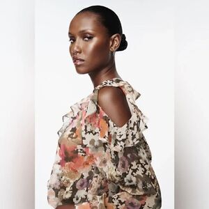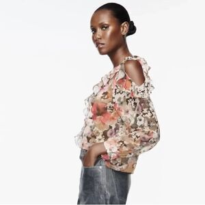 Semi-sheer V-neck shirt featuring long sleeves with cuffs and cut-out shoulders. Ruffle trims.