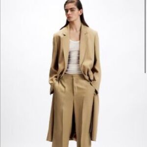 Flowy frock coat with lapel collar and long sleeves. Flap at front ( not functional actual pockets ) . Pronounced topstitching detail. Tonal matching inner lining. Front button closure