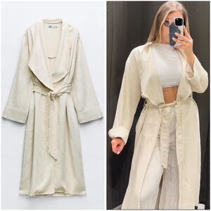 Linen blend trench. Wide lapel collar and long sleeves. Frayed trim. Back vent. Self belt closure.