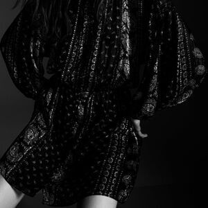 SHORT DRESS WITH HIGH COLLAR. ELBOW-LENGTH BALLOON SLEEVES WITH ELASTIC CUFFS. INTERIOR LINING. ELASTIC WAISTBAND. METALLIC THREAD DETAIL. FRONT BUTTON CLOSURE.