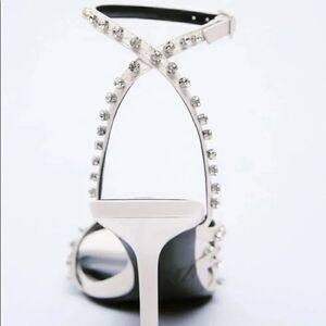 Heeled sandals with studs and sparkly detail on the straps. Squared toe. Buckled ankle strap closure.