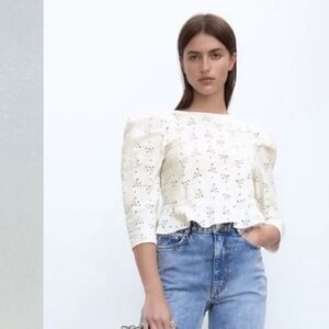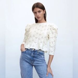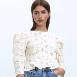 ZARA IVORY WHITE EYELET BLOUSE SHIRT LONG SLEEVE SHOULDER PEPLUM