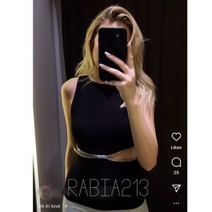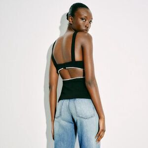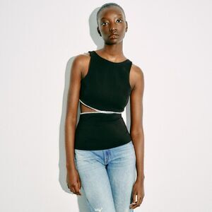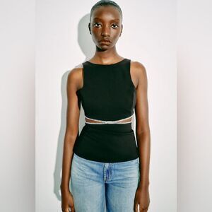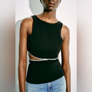 Fitted top with round neck and straps. Cut out detail and jewel appliqués. Tonal interior lining. Back metal hook and hidden in-seam side zip closure.