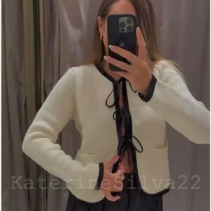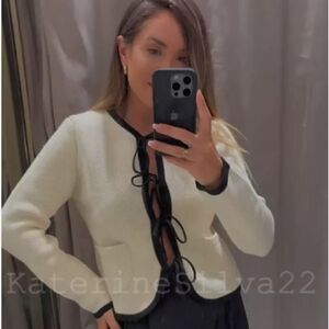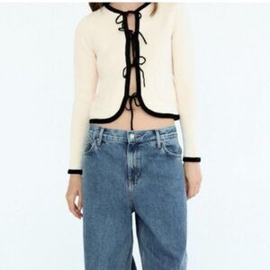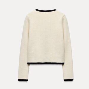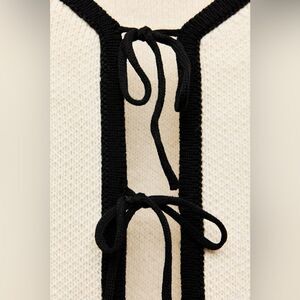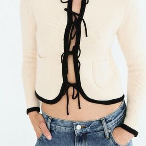 Knit cardigan with round neck and long sleeves. Front patch pockets. Contrasting piping detail. Front tie closure.