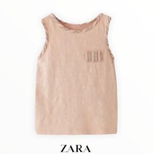 Soft, airy, and effortlessly sweet — this Zara Kids tank top in faded pink is perfect for warm days. Designed with subtle striped piping and a front pocket accent, it brings a modern twist to a classic look.