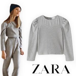 Modern and comfy, this Zara Kids gray ribbed top blends classic simplicity with a touch of texture. Crafted from soft stretch fabric, it features a ribbed front panel, subtle puff sleeves, and a tailored fit that makes it both cozy and stylish for everyday wear.