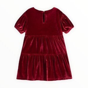 • Style: Tiered velvet dress with short sleeves and gathered skirt