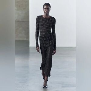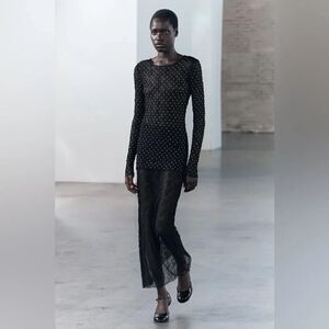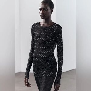 Lace top with a round neck, long sleeves, rhinestone appliqués and an open back.