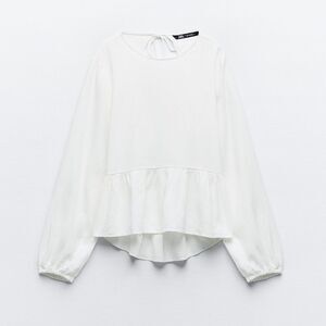 Top made of linen blend fabric. Round neck and long sleeves. Elastic at back. Flounced hem. Back cut out detail. Back tie closure.