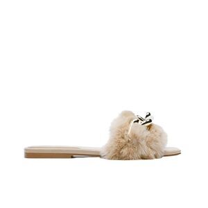 Slide sandals with faux fur front strap and metal buckle. Squared toe.