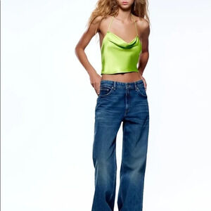Halter top with fluid neckline and adjustable thin straps. Back tie closure.