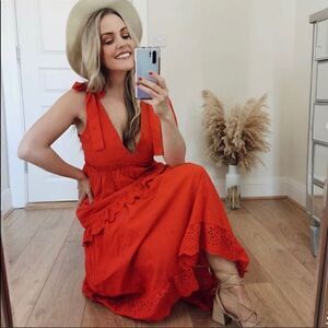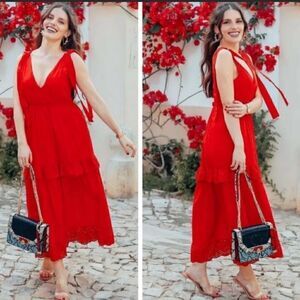 V-neck red midi dress featuring tie straps. Flared hem with matching embroidered appliqués. Invisible side zip fastening.