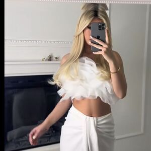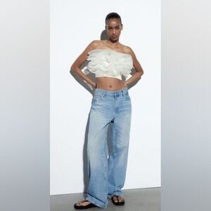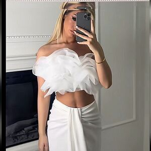 Strapless top with straight neckline. Voluminous organza fabric detail at chest.