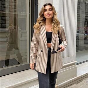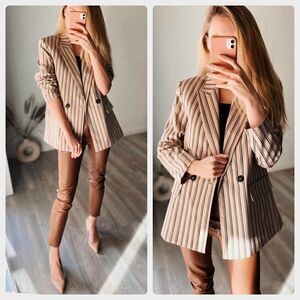 ZARA Oversized Blazer Striped Neutrals Double Breasted