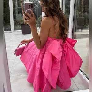 V-neck mini dress with adjustable spaghetti straps. Side hidden in-seam pockets. Maxi bow detail at back. Side hidden in-seam zip closure.