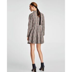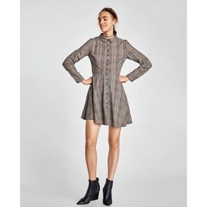 Dress with shirt collar. Long sleeves. Seam at waist. Flared cut. Button fastening at front.