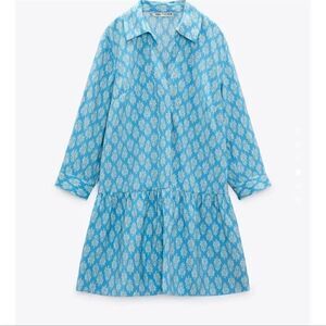Printed mini dress with V-neck lapel collar. Below-the-elbow length sleeves. Flounced hem. Front hidden button closure.