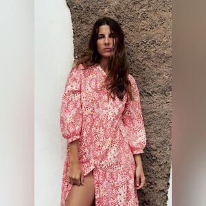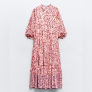 Round collar midi dress with V-neck and elbow-length sleeves. Front button closure.