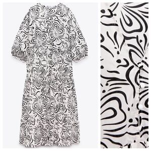 V-neck dress with sleeves falling below the elbow. Front fastening with matching covered buttons.'
