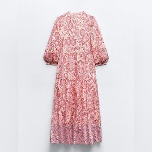 Round collar midi dress with V-neck and elbow-length sleeves. Front button closure.