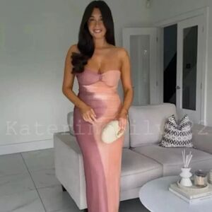 Strapless midi dress with underwire and sweetheart neckline. Ruched fabric. Contrasting interior lining. Back hidden in-seam zip closure.