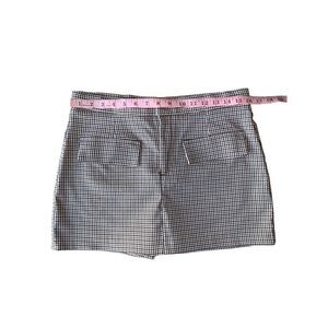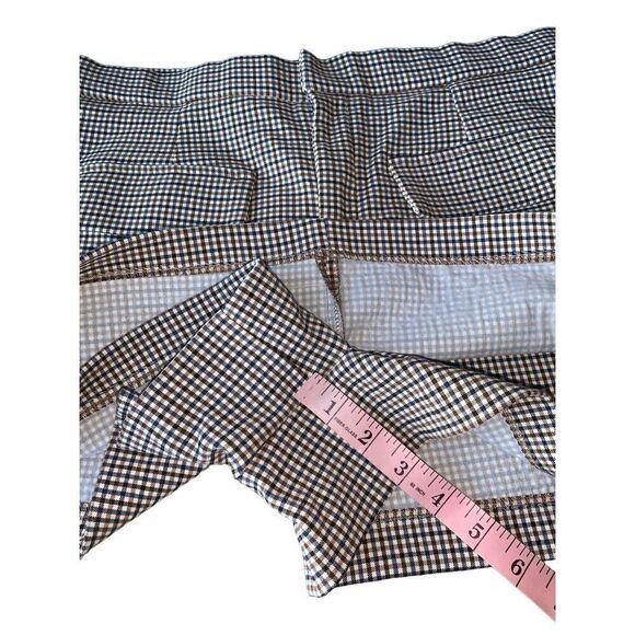 ZARA Plaid Skort size L. It’s tan, brown, and navy blue (see close up picture). It has a zip fly with hooks & button closure, and 2 front faux pockets. Not a ton of stretch on the waist, but the actual skirt does have stretch. Gently used, but in excellent condition, with no flaws.