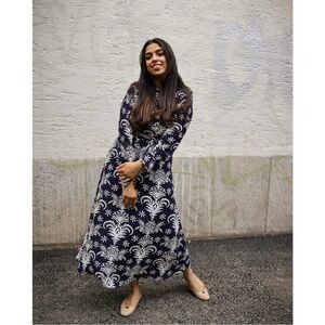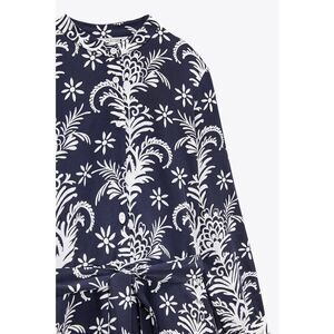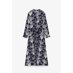 Long dress with round neck and long sleeves with cuffs. Tied self belt. Front button closure.