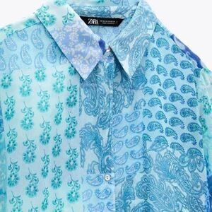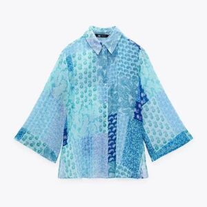 Shirt with lapel collar and long sleeves with cuffs. Front button closure.