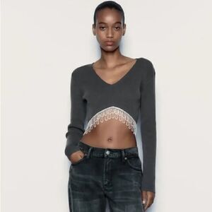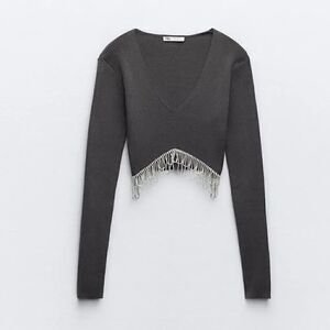 Crop top made of soft-touch fabric. Featuring a V-neckline, long sleeves and metal fringe and rhinestone appliqués on the hem.