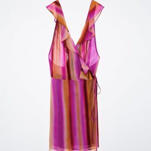 Short dress with V-neck and ruffled wide straps. Front wrap closure with self tie. New with tags