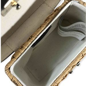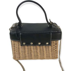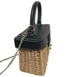 Handbag base is wicker, acrylic top with wood top handle, and detachable shoulder strap.