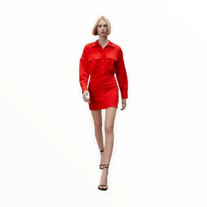 Keywords: Zara red dress, satin shirt dress, red mini dress, utility pocket dress, bold night out look, statement dress