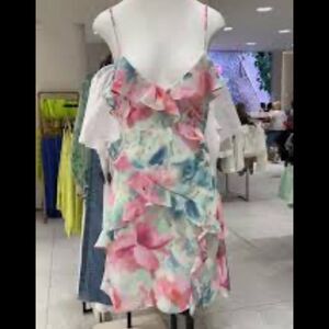 Vibrant dress with ruffled details. Features a mix of pink, blue, and green hues.