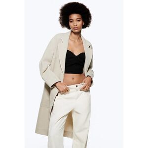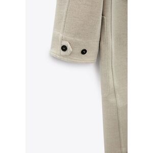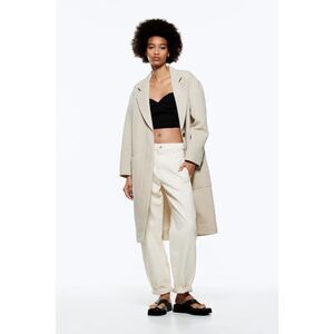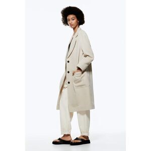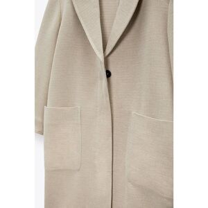 Spun cotton blend coat with a lapel collar, long drop-shoulder sleeves, front patch pockets and front button fastening hidden by a placket.