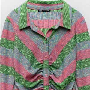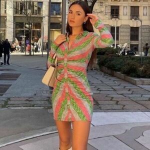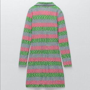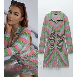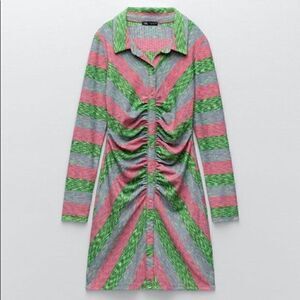 Dress with lapel collar and long sleeves. Front ruching detail. Front button closure.