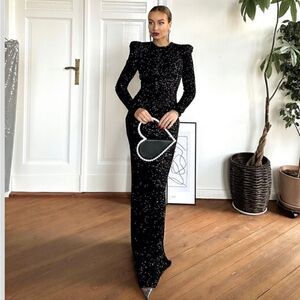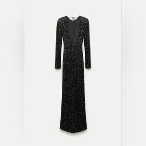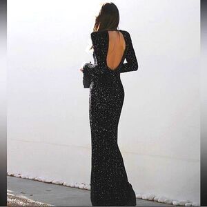 Long dress with round collar and long sleeves with shoulder pads. Open back with tonal ties. Sequin appliqué. Interior lining. Back hidden in-seam zip closure