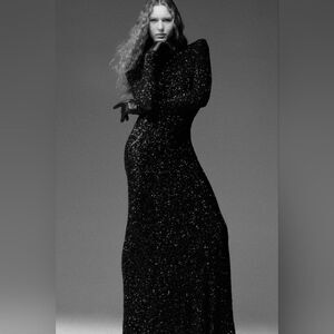 Long dress with round collar and long sleeves with shoulder pads. Open back with tonal ties. Sequin appliqué. Interior lining. Back hidden in-seam zip closure