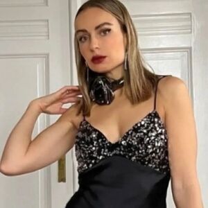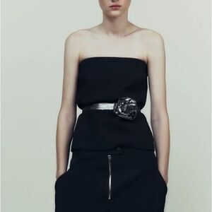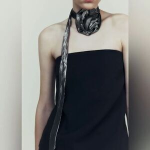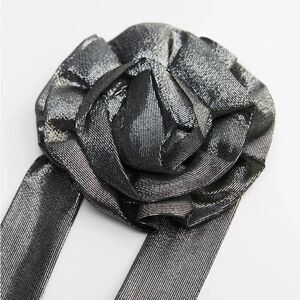 Fine scarf made of silk blend metallic thread fabric. Textured flower appliqué.