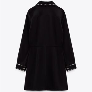 Collared mini dress with long sleeves. Featuring a front patch pocket, stud appliqués, a flared hem and metal button fastening at the front.