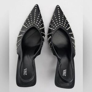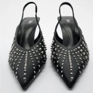 High-heel slingback court shoes. Metal studs on the upper. V vamp. Pointed toe. Strap around the back.