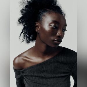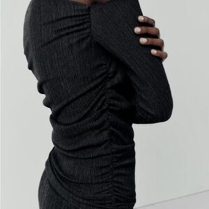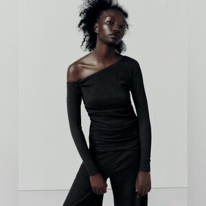 Top made of textured fabric. Asymmetric neckline with long sleeves. Ruching detail at sides.